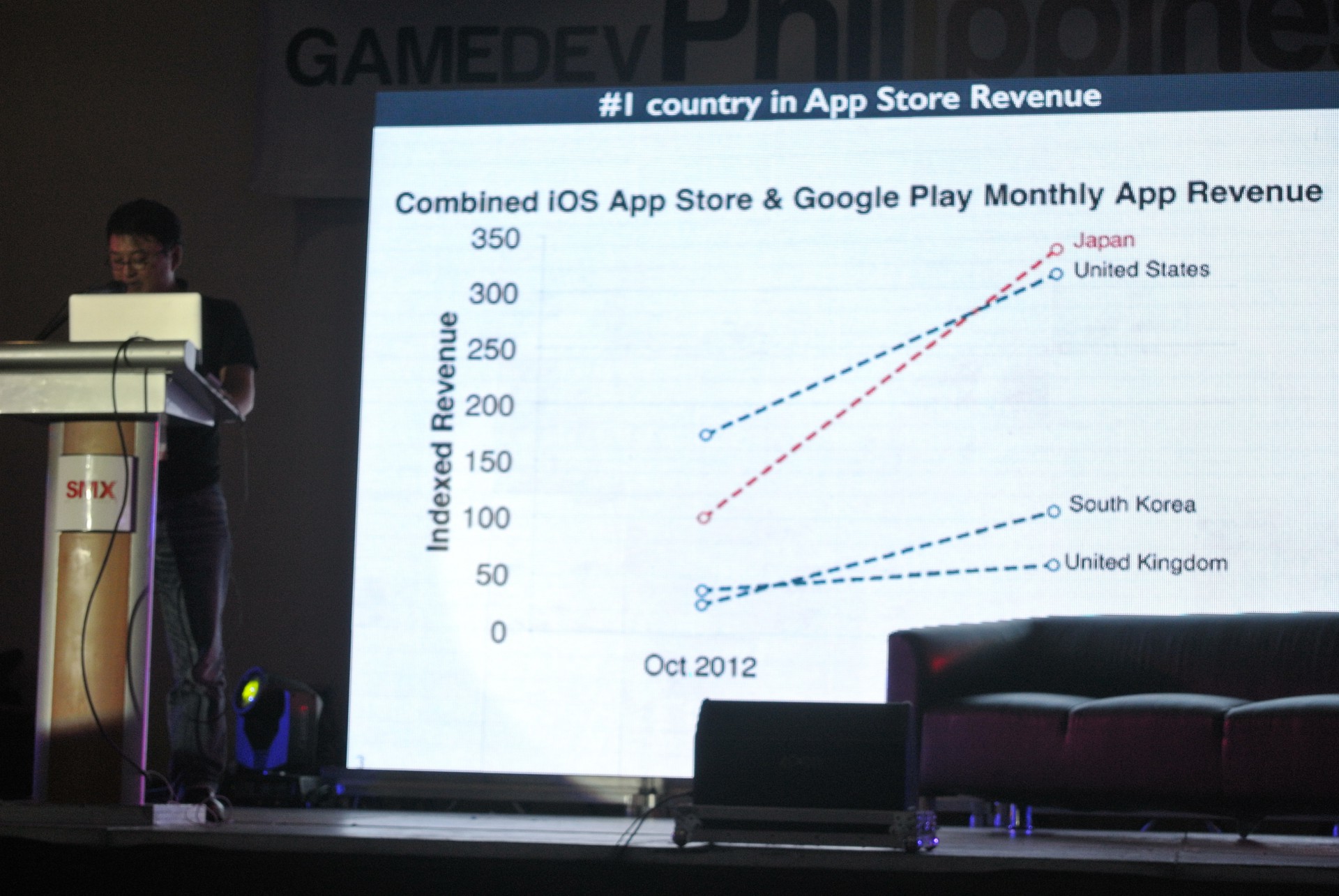 Klab Cyscorpions has an office at the Fort and it exclusively develops games for the Japanese market. Kimi gave some statistics that Japan now is the leading market for mobile games in the world, surpassing the US. Part of the reason is an easier payment scheme. Of the top 10 games in Japan, he cited 3 common points: 1) Good graphics and sound 2) Marketing on television which could reach $1M to $5M 3) Large budget