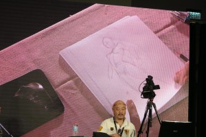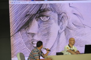 Takuya Wada repeated some of his stories and showed some of the videos the day before. He demonstrated how he draws the head shots from various angles, male, female and hero faces. He also showed how to create more dynamic action and comparing it to traditional action drawing. He said that 3D software can’t imitate the dynamic punch shot he drew as it is programmed for the normal perspective, because the perspective for the more dynamic punch is fake. He did the same with perspective, which he called more cool and another for body stance, the important thing are the main lines where you put them and from there the rest of the drawing follows. When he drew Lupin, he drew it straight using a pen since he said he drew the character so many times already. The said drawing was given to a lucky student who asked some questions in the Q&A portion. Takuya showed some of his drawings where the pencil is the best tool to show the thick and thin lines of which as of the moment that tablets can’t do.
