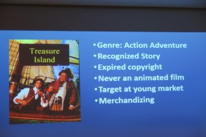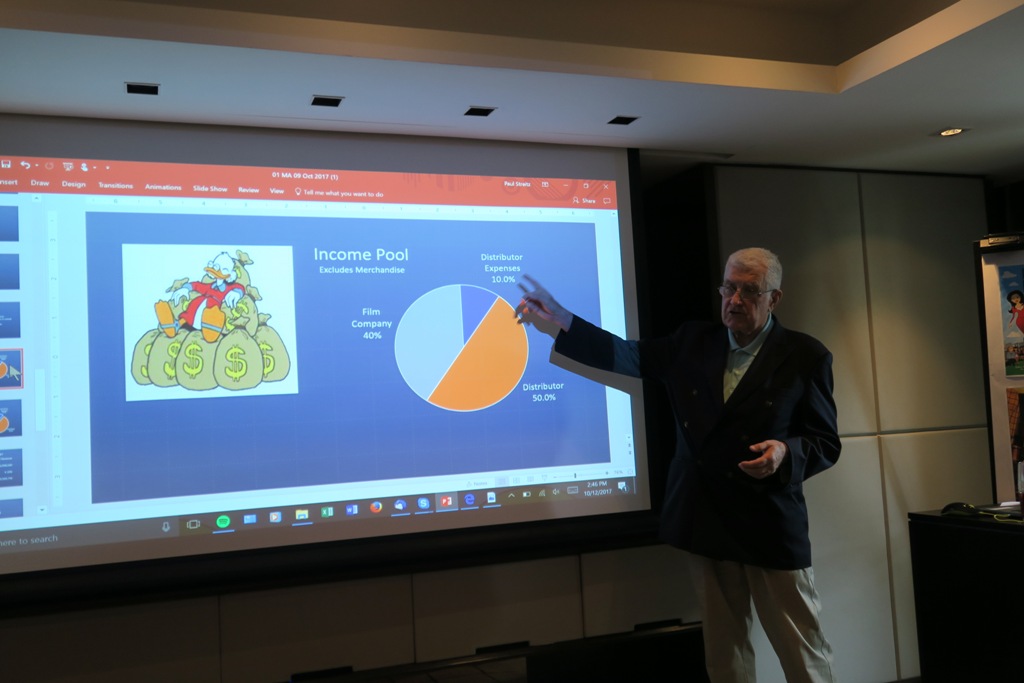 After the brief introduction, Paul showed the business side of the film business, where the dollar and cents were broken down to show that there is money to be made for all the parties involved – from the writer, owner, producer, distributor, merchandiser, and production company. He showed estimated figures for big hit films such as the Simpsons and a not so well known film only shown in the US but the profit figures are still worth the effort. Mickey Mouse and the financial side of the merchandise part of the character was also highlighted. He said that other stories with expired copyright could be ideal animation projects such as ‘Treasure Island’, Wizard of Oz’,’Oklahoma’ and ‘Annie’.