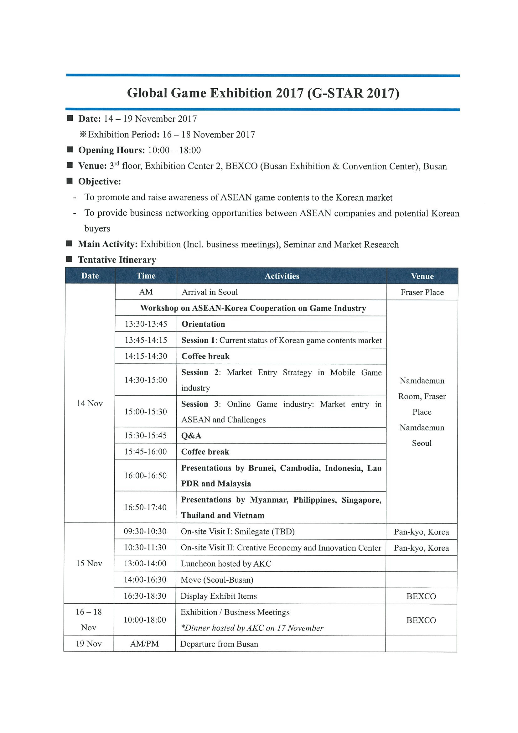 Title of the Exhibition: Global Game Exhibition 2017 (G-Star 2017) Date: 16 – 18 November 2017 Mission Period: 14 – 19 November 2017 Opening Hours: 10:00 – 18:00