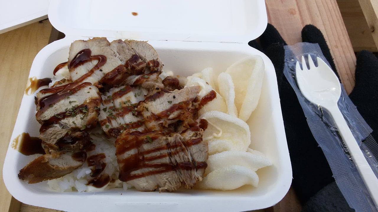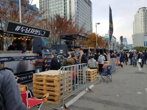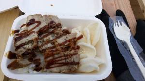 We tried one of the food trucks outside for lunch this time at around 11:30 am, we chose the shortest line with barbecue ribs. The price was equivalent to P280 for a single serving. It was good though, but we had to eat at tables made out of cargo planks at the parking area. There were also some cosplayers who posed with the crowd at the food truck area.