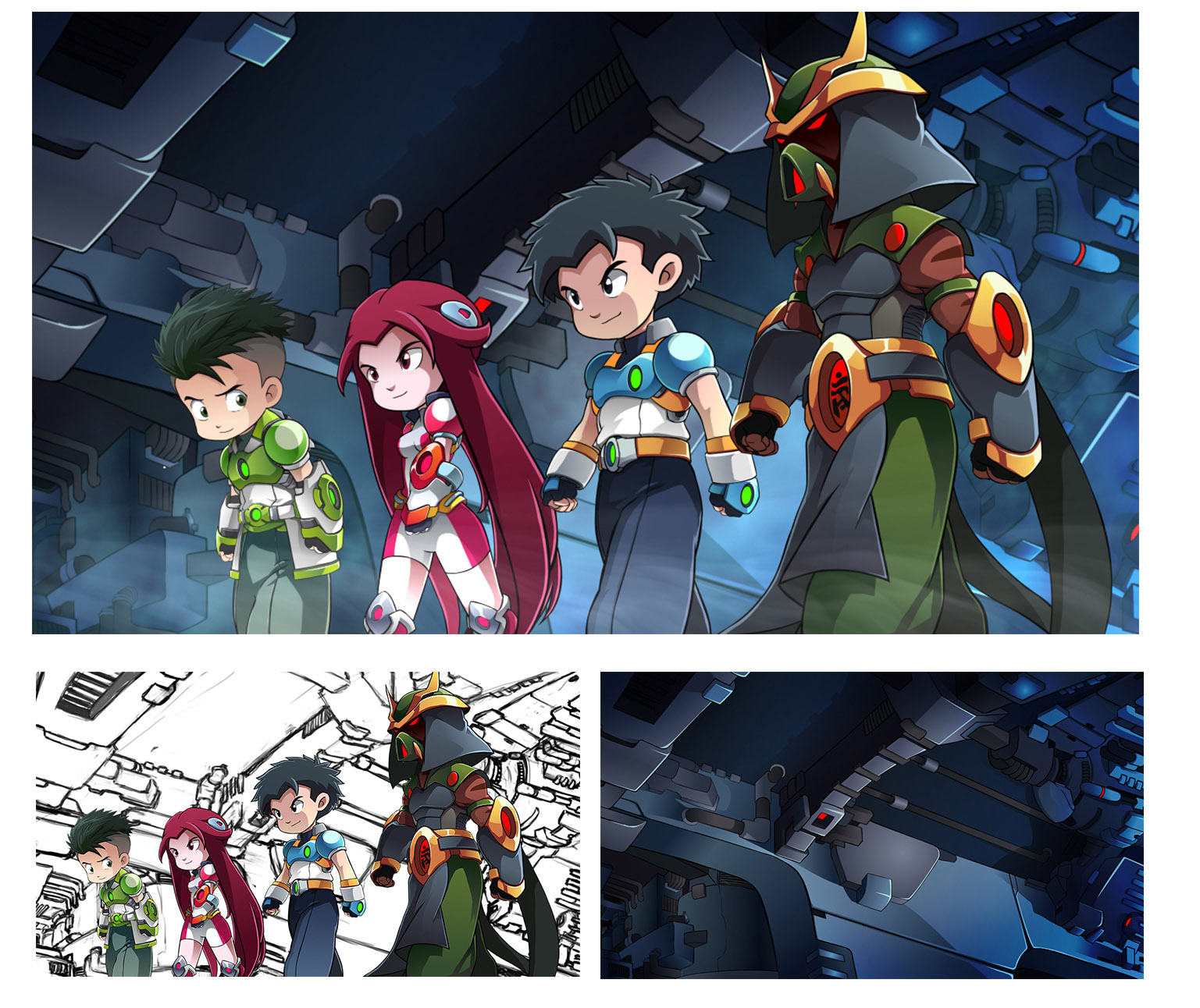 I did a storyline for the mobile game way back sometime in 2014 and we started doing the assets – the characters and villains first. At first, we just used the usual look at the main characters and did a poster and sample animation. But after many months of getting nowhere, we decided to get a consultant in the industry sometime in December 2014.  Some of the said drafts were animated and shown to some prospects at the Tokyo Game Show last September 2014 (See the essay on the Tokyo Game Show). Eventually, the look of the assets and backgrounds were improved by the mobile team in the following years. The mobile team had a freehand in adding assets, designing the backgrounds and the gameplay up to the official version of the game in 2017.  I only gave some comments to improve the intro after reviewing it and add some explosive devices in the city scene. Shown below are some of the first drafts for the assets and posters for the mobile game in 2014.